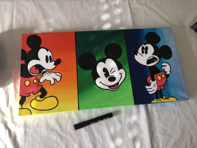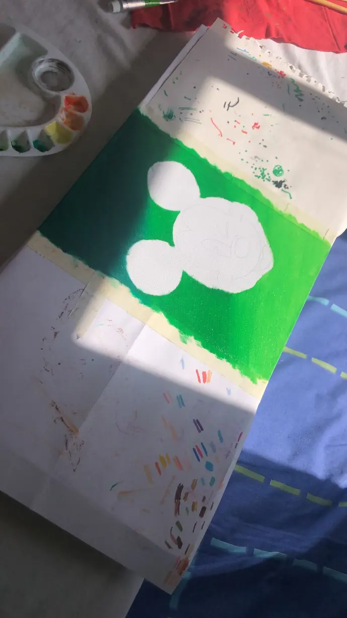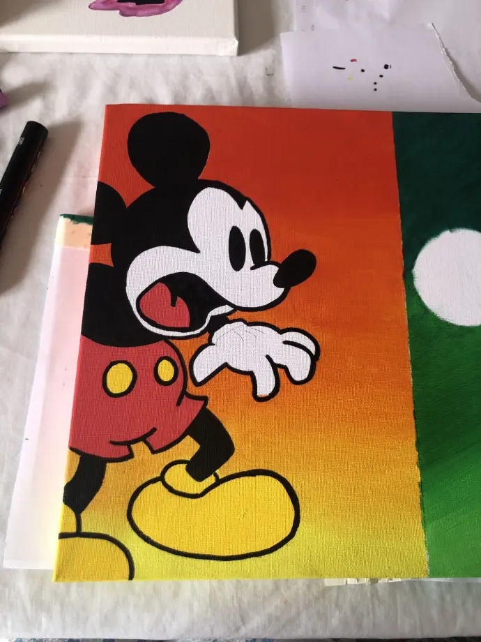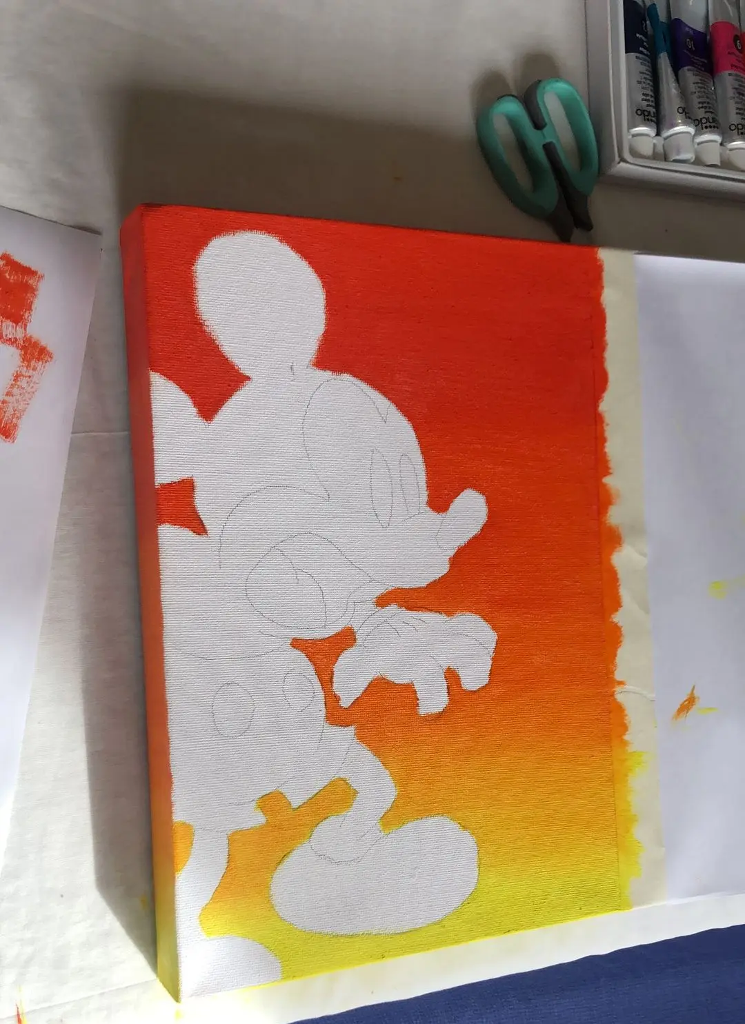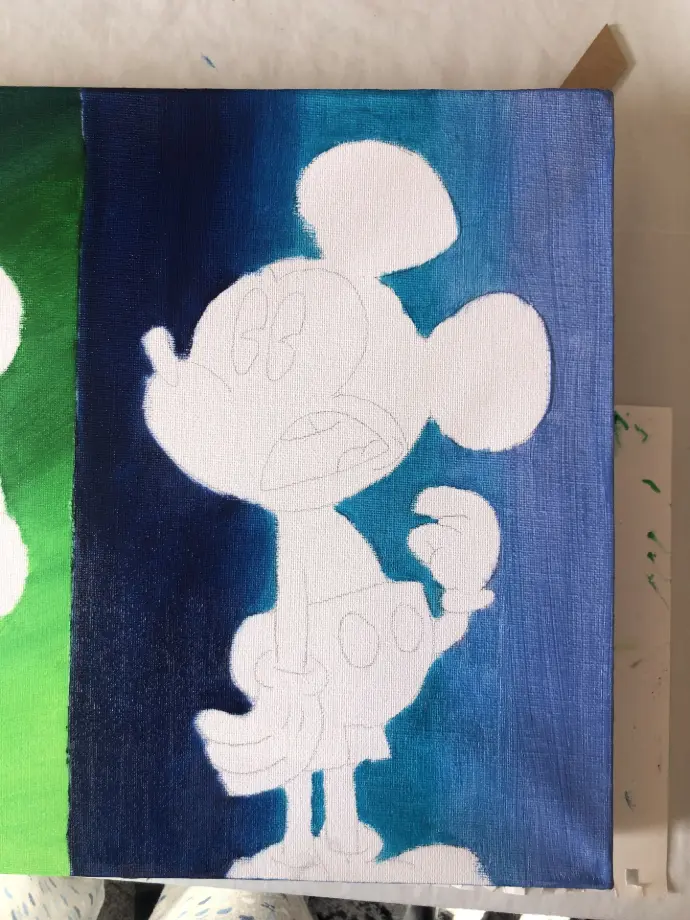 El primer paso en la creación de este cuadro fue decidir el concepto principal. Inspirándome en personajes animados clásicos, dibujé una silueta en el lienzo. Este boceto inicial sirve como guía para el diseño y ayuda a definir las áreas que quedarán en blanco mientras trabajo el fondo. Es importante usar lápiz suave para que las líneas sean visibles, pero fáciles de cubrir con pintura posteriormente.